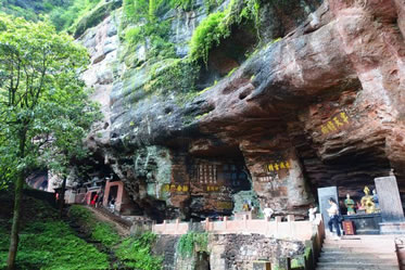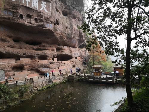 真仙洞府:過(guò)天門巖,下石階即達(dá)。這里危崖三彎折,相連如城垣。巖下通道沿砌石欄桿,欄外為碧蓮池,共構(gòu)一“叵”字形;崖間洞窟累累,依次有八仙洞、觀音洞、真仙洞(羅漢洞)、雨君洞、文昌洞、白馬洞、珠簾洞,就洞建宮宇,祀道教各路神仙,統(tǒng)稱真仙洞府。崖壁、摩崖題字石刻,如“天開神秀”、“齊云勝景”等多達(dá)近百處。