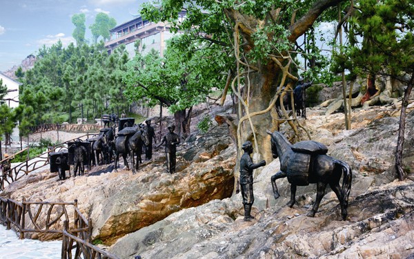 五千年文博園復(fù)原茶馬古道滇藏路線一段,設(shè)麗江客棧、香格里拉客棧,長500米。古道依山體而建,以人物雕塑、實景微縮的形式,打造出馬幫、背夫、牦牛在崇山峻嶺間穿梭,翻山越嶺、長途跋涉的意境。形象逼真、栩栩如生,再現(xiàn)了辛勤的馬幫日復(fù)一日、年復(fù)一年,用生與死開辟出一條通往域外的經(jīng)貿(mào)之路,一條人文精神的超越之路,也因此歌頌?zāi)切椴貪h民族的團結(jié)和興旺作出貢獻的人們。