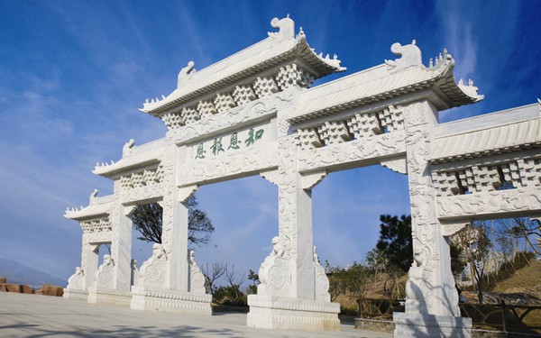 牌坊,一種中國特有的門洞式建筑,《現(xiàn)代漢語詞典》解釋為“形狀像牌樓的建筑物,舊時多用來表彰忠孝節(jié)義的人物”,現(xiàn)被視為中華文化的一個典型標志。位于五千年文博園標志性建筑盤龍下方的牌坊高9.6米,寬28米,以草白玉為材質(zhì),石砌整塊雕刻而成,上刻有趙樸初先生書法體“知恩報恩”四字,以此四字為做人準則,來回報社會。