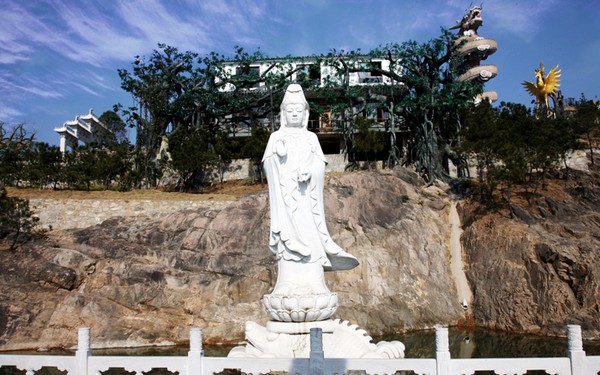 矗立于五千年文化長廊的滴水觀音塑像,其高16米,由草白玉雕刻而成。她腳踩鰲魚,衣袖流暢,手持凈瓶,凈瓶盛裝著甘露,略帶笑意,具有無量的智慧和神通,普救人間疾苦。她的慈光,如同一輪皎潔的皓月,高懸夜空,普照大地,護佑著苦難眾生;其凈瓶中的甘露永流不息,滴水聲仿佛在向游人展示把那甘露灑至世界每一角落,流進人們的心理,凈化世人的心靈,故有‘戶戶阿彌陀,家家觀世音!’的贊語。文博園的滴水觀音大氣端莊,生動傳神,具有濃厚的民族性,是人類珍貴的文化藝術(shù)瑰寶。