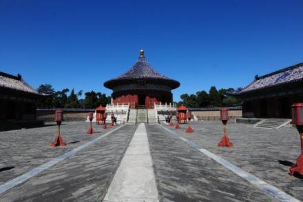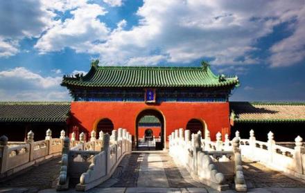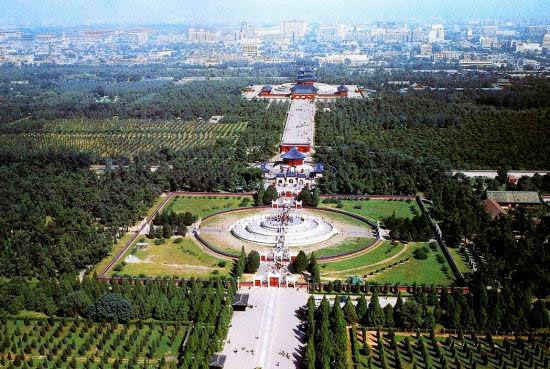 天壇公園由兩道壇墻環(huán)繞,被分為“內(nèi)壇”“外壇”兩部分;域北呈圓形,南為方形,寓意“天圓地方”;主要由春季祈禱豐年的“祈谷壇”,冬至日祭天的“圜丘壇”,皇帝祭祀前居住的齋宮、演習祭祀禮樂的神樂署四大古建筑群組成;祈谷壇中的祈年殿是北京市的標志性建筑。天壇公園外壇種植有大量古柏林。
