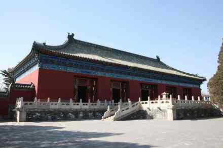 無梁殿:即齋宮正殿,建于明永樂十八年(1420年)。此殿因以磚拱承重,不用梁枋而得名;实圻M出齋宮均在此舉行有關(guān)禮儀,F(xiàn)殿內(nèi)按乾隆時期原貌陳列,橫額“欽若昊天”為乾隆御筆,屏風、寶座均為原物。