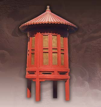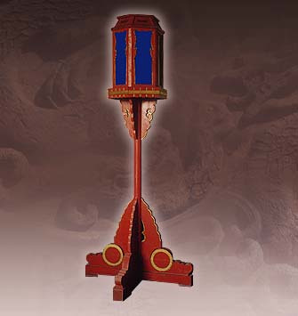 通高191厘米,燈罩邊長34厘米,托座邊長50厘米,高55厘米,寬42厘米,攢頤尖頂高8.5厘米,寬34厘米,六棱。底座長79厘米。座燈由燈罩、底座兩部分組成,燈罩六棱,上收,平頂,每面鑲透明玻璃。底座上以圓立柱支撐托座,以承燈罩。底座四歧呈十字形。通身紅色金緣。插燈與座燈同,只是底座插在石礎內(nèi),置于殿內(nèi)及路側(cè)。