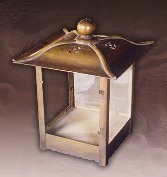 清末造。通高36.5厘米,檐方28厘米,足方20.6厘米。方形,四邊銅框,凹面玻璃心,一面為門,銅框兩側(cè)、底云花裝飾,挑形活頁二,桃形吊環(huán),底邊有花紋,蓋頂穹隆形,四脊間飾四縷空金錢眼紋,頂飾圓尖鈕。陳設于祭壇正位前和臺階上,用于祭祀時照明。