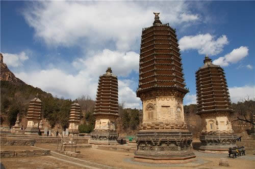 其他11座塔均為喇嘛塔。有石及磚石兩種結(jié)構(gòu)形式,形制較簡單,尺度亦較小,最高的自塔頂圓盤至地面高5.71米,最低的殘存部分僅高1米有余。備塔的形制、基座部分均為石砌須彌座式,平面有四邊和六邊形兩種形式。塔身部分均為覆缽形,有磚砌和石砌兩種。石砌的塔身均于正面設(shè)有眼光門。塔身與基座之間施以石刻蓮瓣及金剛?cè)?shù)層。塔頂部分,塔脖子均作石刻束腰形,其上為相輪組成的十三天及圓盤等石刻裝飾。 |