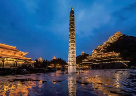 九黎神柱是苗族的象征之柱,采用漢白玉精雕細(xì)刻而成,總高24米,象征一年四季十二個(gè)月、二十四節(jié)氣,有圓滿團(tuán)圓之意。神柱上雕刻苗族古歌里崇拜的三十六堂鬼、七十二堂神(三十六天罡、七十二地煞)雕像,這些鬼神都是苗族的保護(hù)神。苗族先民把楓木作為圖騰,由于楓樹木放在室外容易腐爛,九黎神柱采用石材雕刻而成,是雕刻人物最多的少數(shù)民族圖騰柱。是蚩尤黎城第三個(gè)被列入大世界基尼斯之最的建筑。