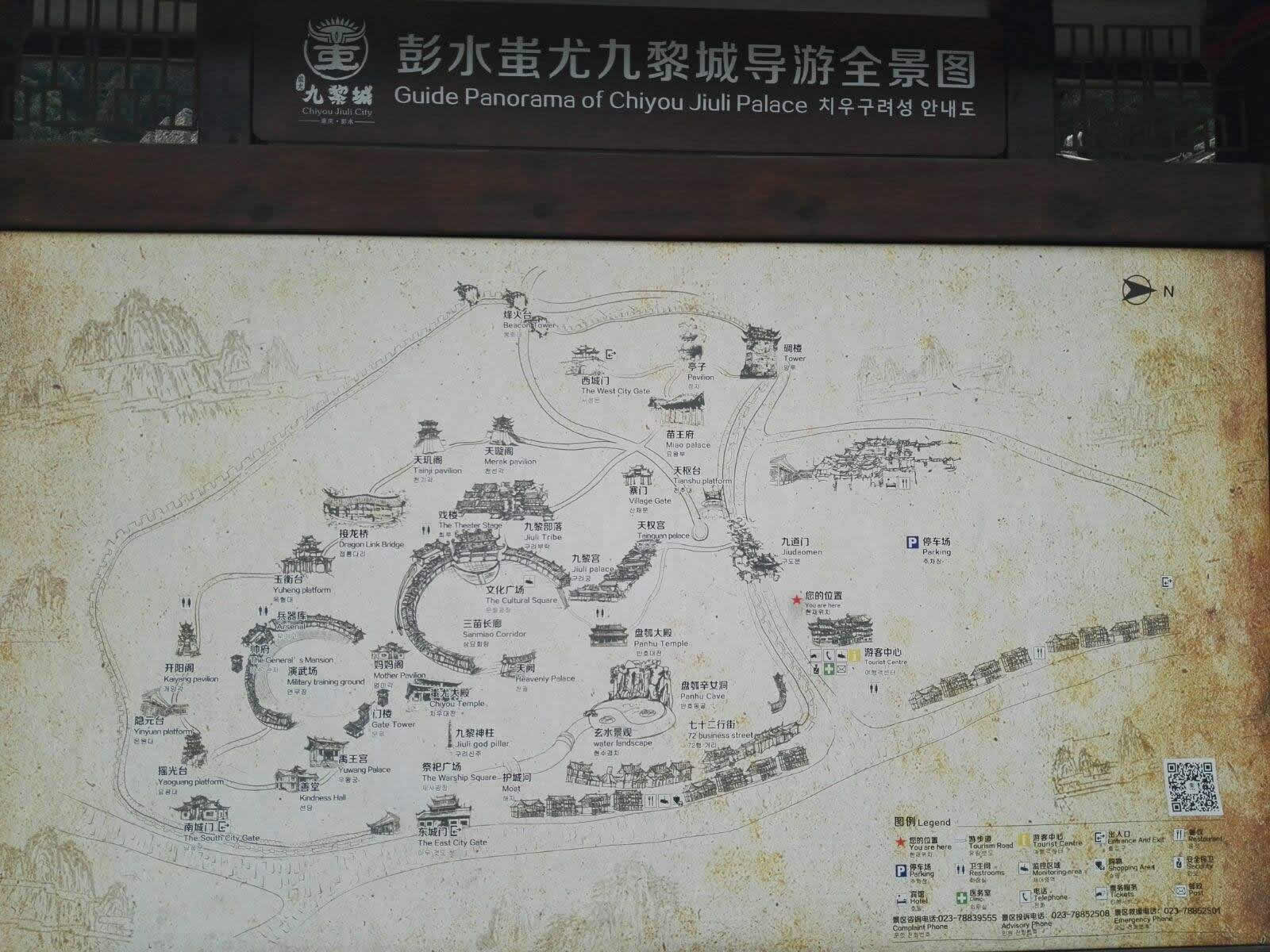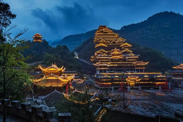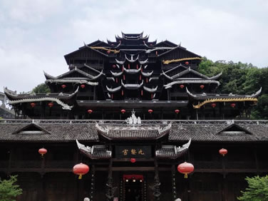 九黎宮位于景區(qū)中心苗族文化廣場右邊,是蚩尤九黎城最重要的標(biāo)志性建筑,九黎宮科學(xué)地利用山水自然資源,因地制宜,依山造勢,退山而居。宮高99米,呈十一開間,象征“九九歸一”之意。建筑的形式有四合院、吊腳樓、沖天樓,宮內(nèi)有苗族接龍?zhí)谩駱、虎口堂、四合院、八字朝門和吊腳樓群等,是彭水展示苗族文化、民風(fēng)民俗的博物館,是迄今為止最大的吊腳樓群之一,被列入大世界基尼斯之最。