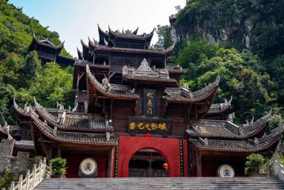 九道門是蚩尤九黎城的標(biāo)志性建筑,是進(jìn)入景區(qū)的主要通道。沿山脊建有3座石門、3座木門、3座磚木結(jié)構(gòu)門,每座牌門建筑錯(cuò)落有致,造型各異,以九黎部落命名,分別名為畎夷門、于夷門、方夷門、黃夷門、白夷門、赤夷門、玄夷門、風(fēng)夷門、陽夷門。采用金、木、水、火、土天地五行作為用材和風(fēng)水的象征,面朝北方。每一座牌門上都雕刻有苗族民俗文化、歷史故事和民間吉祥的圖騰!熬诺篱T”是世界上唯一的九進(jìn)門庭,已被列入上海大世界基尼斯之最。