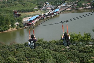 空中飛人滑索項目位于觀音廟后,依山勢而建,在果樹山林之間架起了一段全程300米、落差50米,每秒7.5米滑行速度的高空索道,在歷時40秒滑行時間中,游客在享受高空索道帶來驚險刺激體驗同時,可一覽園區(qū)秀美風(fēng)景并,讓人回味無窮。