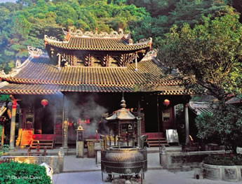 三絕:大雄寶殿后面山上綠樹繁蔭,但大殿屋頂上卻沒(méi)有一片樹葉,這究竟是什么原因?仍是個(gè)謎。