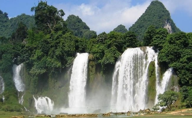 德天瀑布雄奇瑰麗,變幻多姿,碧水長流,永不涸歇。瀑布四季景色不同,春天凌草泛青,山花吐艷,瀑布四周被鑲起五彩繽紛的花邊;秋天梯田鋪金,層林盡染,高掛的銀簾霧氣沖天;冬天瓊珠閃閃,玉液潺瀑,山風把細流吹得飄飄灑灑;夏天激流如