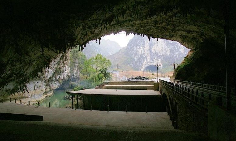 穿龍巖,位于縣城內(nèi)西北面,因其古時候為路人步行入城的必經(jīng)之道而又名鳳陽關(guān)。其西南面石壁高約180m,130m處有一小溶洞,被稱作鳳山的“鳳眼”,夕陽晚照,滿壁金光,為鳳山八景之一“丹崖晚照”。穿龍巖南面洞口寬約80m,高約30m,其中河床寬約20m。整個穿龍巖最寬約200m(含河床寬度),深度為400m,最高高度約100m,洞廳面積4.15萬平方米,排名中國第五。