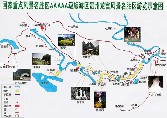 景區(qū)以溶洞、洞穴、瀑布為主體,堪稱黔中一絕,包括龍宮、油菜湖、漩塘、螞蟥四大片區(qū)。龍宮中心區(qū)有臥龍湖、迎賓洞、龍門飛瀑、龍?zhí)短斐亍垖m暗湖、蚌殼巖、虎穴洞等景點(diǎn)組成,上下輝映,別有洞天,宛如神話中龍王所居的水晶宮殿。天池是一個(gè)山間湖泊,澄綠如玉,俗稱龍?zhí),湖水下瀉,從巨大的溶洞跌拓而下,水墻壁立,寬25米,高約50米,驚濤奔涌,蔚為壯觀,此即龍門,據(jù)稱為中國地下瀑布之冠。這里有五段串珠式的暗洞、湖溶洞型地下河,五進(jìn)五出,稱為五進(jìn)龍宮,全長15公里,造型非常奇特,是中國發(fā)現(xiàn)的,最長的水上巖溶。