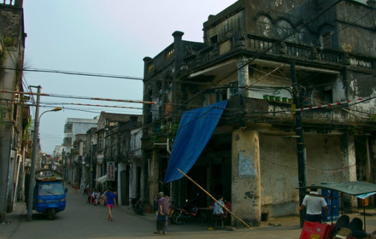 據(jù)史書記載,定安古城從籌建到1519年竣工共費時13年。城圍長近千米,高四米多,寬五米多,開有東、南、西城門,各建有城樓。北門是1545年才開的,后來因不堪倭寇的騷擾,曾經(jīng)堵上過,直到1690年才又重開。古城的城墻在建國初期就已經(jīng)被拆毀了,城門這一塊大概是因為看它結實牢固,便利用來建了樓房,因此還被保存下來。城門洞里放著兩只卸了龍頭的龍舟,已經(jīng)很舊,架在木樁子上。地是用青石板鋪設的,經(jīng)過幾百年人來人往,石板被磨得很薄。門洞里的墻面上也是一塊塊青石磚砌的,摸上去很干爽,一點也沒有陳年的霉味。