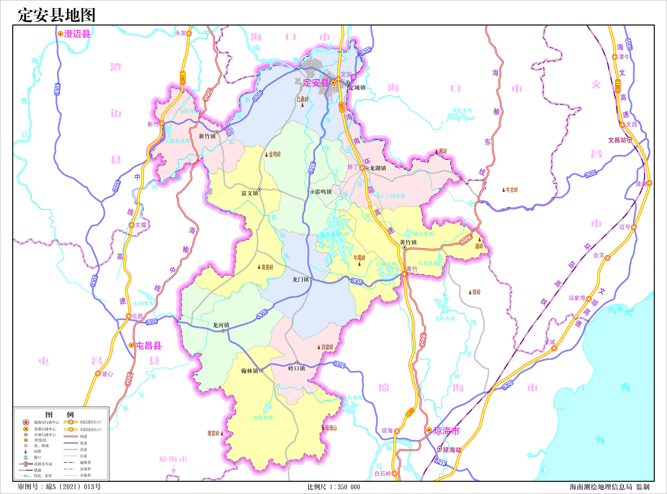 定安縣轄10個鎮(zhèn):定城鎮(zhèn)、新竹鎮(zhèn)、龍湖鎮(zhèn)、黃竹鎮(zhèn)、雷鳴鎮(zhèn)、龍門鎮(zhèn)、龍河鎮(zhèn)、嶺口鎮(zhèn)、翰林鎮(zhèn)、富文鎮(zhèn)