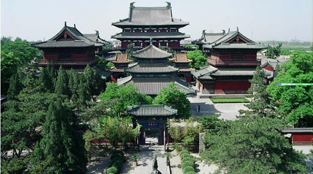 隆興寺:位于石家莊市正定縣縣城,是國(guó)內(nèi)現(xiàn)存時(shí)代較早、規(guī)模較大而又保存完整的佛教寺院之一。隆興寺始建于隋開皇六年(586年),原名“龍藏寺”。宋初,太祖祖趙匡胤敕令在龍藏寺內(nèi)鑄造銅佛,并蓋大悲閣,遂大興土,以大悲閣為主體的一組宋代建筑先后告成。到了清康熙、乾隆年間,又兩次大規(guī)模維修和增建,寺院發(fā)展到鼎盛時(shí)期。清康熙四十八年(1709),改龍藏寺為隆興寺,俗稱大佛寺。 隆興寺這座千年古剎,歷代帝王曾多次到此巡境幸駐蹕,上香禮佛,題詩書匾,刻碑立石?梢姰(dāng)年這里晨鐘暮鼓,鐘磬齊鳴,香煙繚繞,“南無”聲聲的歷史盛況。大悲閣是隆興寺的主體建筑,五檐三層,高33米。閣內(nèi)正矗立著高大銅佛鑄像,這就是名聞遐邇的正定大菩薩。這尊千手千眼觀音菩薩像有22.28米高,有42臂分別執(zhí)日、月、凈瓶、寶杖、寶鏡、金剛杵等法器。面部情端祥恬靜,仁慈莊重。達(dá)到了瞻之彌高、仰之益恭的藝術(shù)效果。