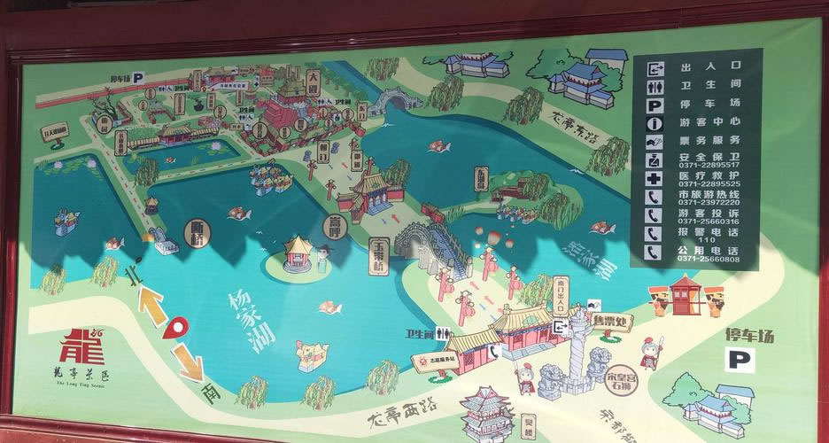 占地面積1300多畝,其中水域面積710畝。全園包括午門、玉帶橋、朝門、照壁、朝房、龍亭公園、北宋皇宮宸拱門遺址、碑亭、北門及東門等清朝萬壽宮建筑群體,還有潘楊二湖、春園、盆景園、號(hào)稱中原一絕的植物造型園及長廊水榭等園林景觀。龍亭公園大殿高26.7米,基高13米,坐北朝南。東西兩側(cè)各有八間朝房,與大殿組成完整的宮殿院落,其內(nèi)建有中國首座大型宋代蠟像館,63個(gè)人物蠟像形神兼?zhèn)洌蜩蛉缟。御道兩?cè)為著名的楊湖和潘湖。雖然兩湖東西相鄰,但楊湖清澈見底,恰似北宋名臣楊繼業(yè)的光明磊落,潘湖卻渾濁不堪,正如北宋奸臣潘美的卑鄙齷齪。整個(gè)園區(qū)既有北方宮殿雄渾之氣魄,又兼南國園林秀麗之風(fēng)姿。