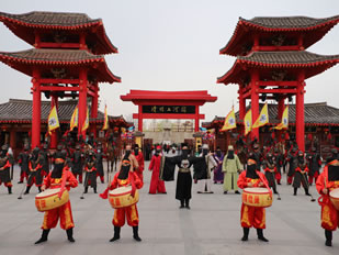 迎賓門是清明上河園的東大門,與之對應的西門稱為金水門。迎賓門位于龍亭湖區(qū)域中心位置。每天上午9點清明上河園開園迎賓,故稱迎賓門。