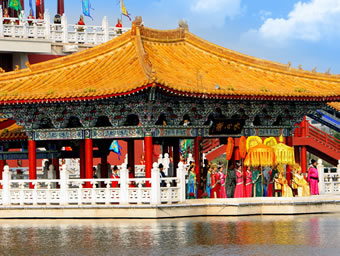 清明上河園中的這座水心榭,四面臨水,一橋相連,顯得通透空靈;榭頂玲瓏,梁柱纖秀,清麗雅致仿若出水芙蓉。隔水聆聽由水榭傳來的管弦之樂,絲樂緲緲,簡直是神仙洞府也難以比擬的人間樂趣。