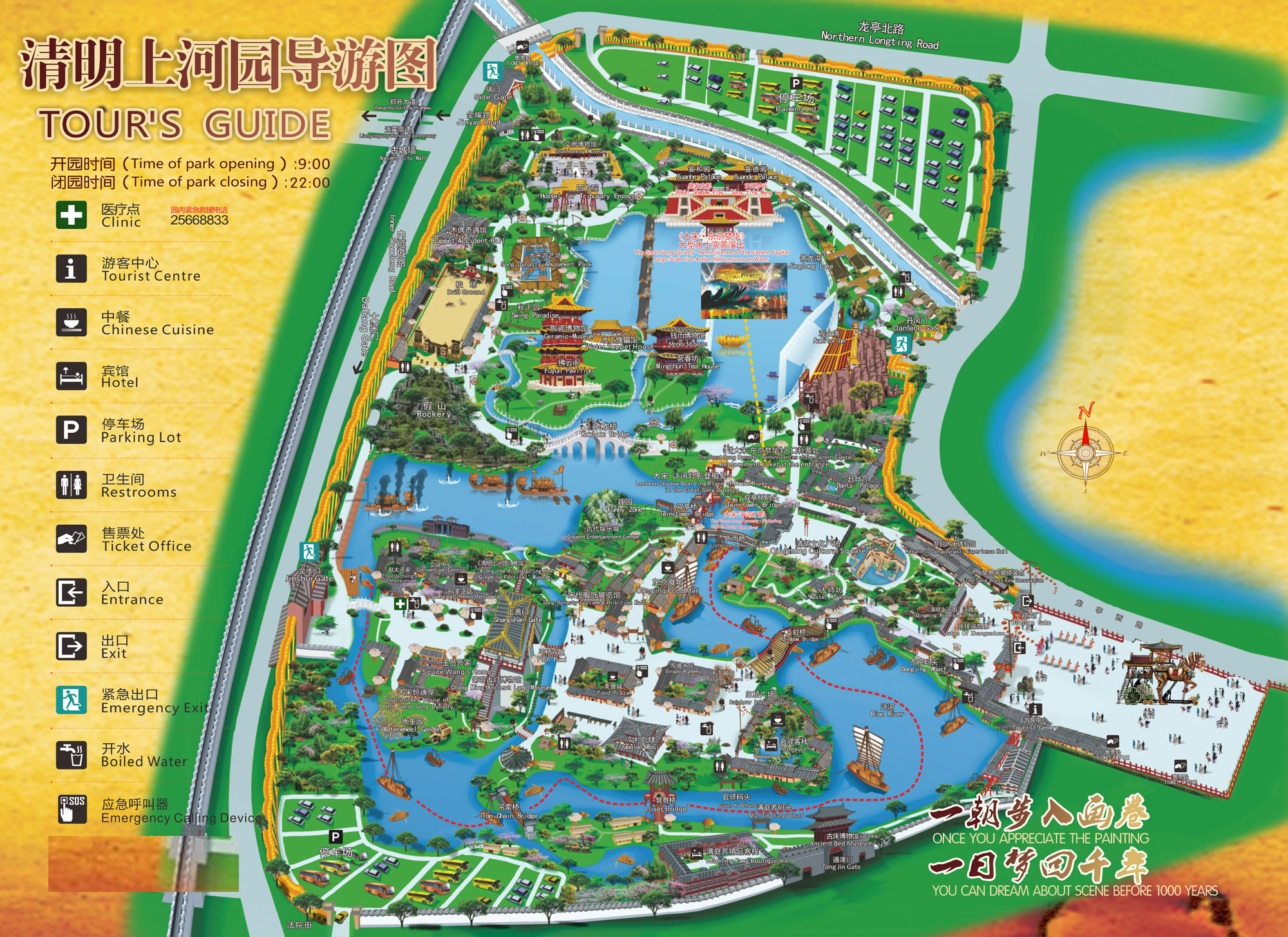 連霍高速、大廣高速、日南高速、鄭民高速均可到達清明上河園,導航清明上河園端門,進入北側1號停車場。