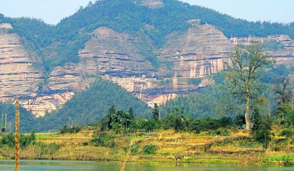 銅梁山位于湘潭縣石鼓鎮(zhèn)境內(nèi),山脈海拔700多米,地勢極為偏僻,正好處于湘潭縣與雙峰縣的交界之處。銅梁山名稱由來還有個美麗的傳說。在雙峰縣井字鎮(zhèn)與湘潭縣、湘鄉(xiāng)市交界處,有一座大山叫昌山。主峰靈應(yīng)峰海拔755.1米,是南岳72峰之一。在主峰與鷹尖石之間,橫臥著一條長達2公里的一字形平脊嶺,當?shù)厝私兴?ldquo;一字大脊”。相傳有一仙人挑著兩個大小不一的籮筐,掌燈時分就來到了大山腳下的花山村。熱情好客的花山人見了這位外來客人,格外歡喜,他們以美酒佳肴相陪,不知不覺已到雞鳴。仙人突然想起師父“雞鳴前一定要翻過大山”的教誨,趲告辭,挑起擔子飛也似的上山去。可是,送客的花山人一會兒便發(fā)現(xiàn),那人的擔子擱在了山頂,扁擔成了一條“一字脊”,兩個籮筐便成了一字脊兩端的“巒柱”,形似一個巨大的銅梁。因此,銅梁山這個美名便叫開了。
