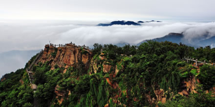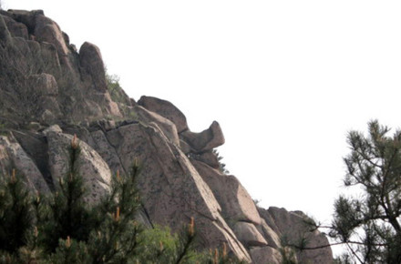 從遠(yuǎn)處山腰眺望一線天,這里就是著名的八戒石.很像一個(gè)戴著僧帽的老豬在綠樹(shù)叢中呼呼大睡。一線天下面是花果山山名摩崖石刻,游客都愛(ài)在這里留影,青山紅字,非常壯麗。這里還有天然碑、硯石等景觀。沿小路前進(jìn)可至墨香小徑,里面有百余位當(dāng)代書(shū)法名家的作品刻在天然石塊上;還可至怪石園,看千奇百怪與《西游記》有關(guān)的象形石!吧瘛弊滞踉跂|部禿龍溝下,是刻在山體上的懷素草書(shū)“神”字,長(zhǎng)39.4米、寬15.8米,為世界上最大的單體漢字,1996年被載入吉尼斯世界紀(jì)錄。 登上玉女峰是花果山之游的高潮,有緣的人在這里可看到云臺(tái)山兩個(gè)最為精彩的景致。一個(gè)是在迎曙亭看海上日出;另一個(gè)是看云臺(tái)鋪海,白云翻滾好像海水揚(yáng)波,露出來(lái)的峰頂就像大海里的蓬萊仙島,群山俯伏,阡陌縱橫,此情此景令人有飄飄欲仙的感覺(jué)。