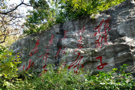 在一塊塊自然山石上,鐫刻著當(dāng)代書(shū)法名家的作品,因名“墨香小徑”。踏入這條小徑,便會(huì)為104塊天然石上的書(shū)法瑰寶所陶醉。字因石愈顯其秀,石因字更顯其神。真草隸篆,形體各異;顏肌柳骨,風(fēng)韻不同。啟功、沈鵬、李苦禪、沙孟海、林散之、武中奇、范曾、舒同、李淑一、蕭嫻、李一氓、郭化若等位大師的真跡,為勝境錦上添花。