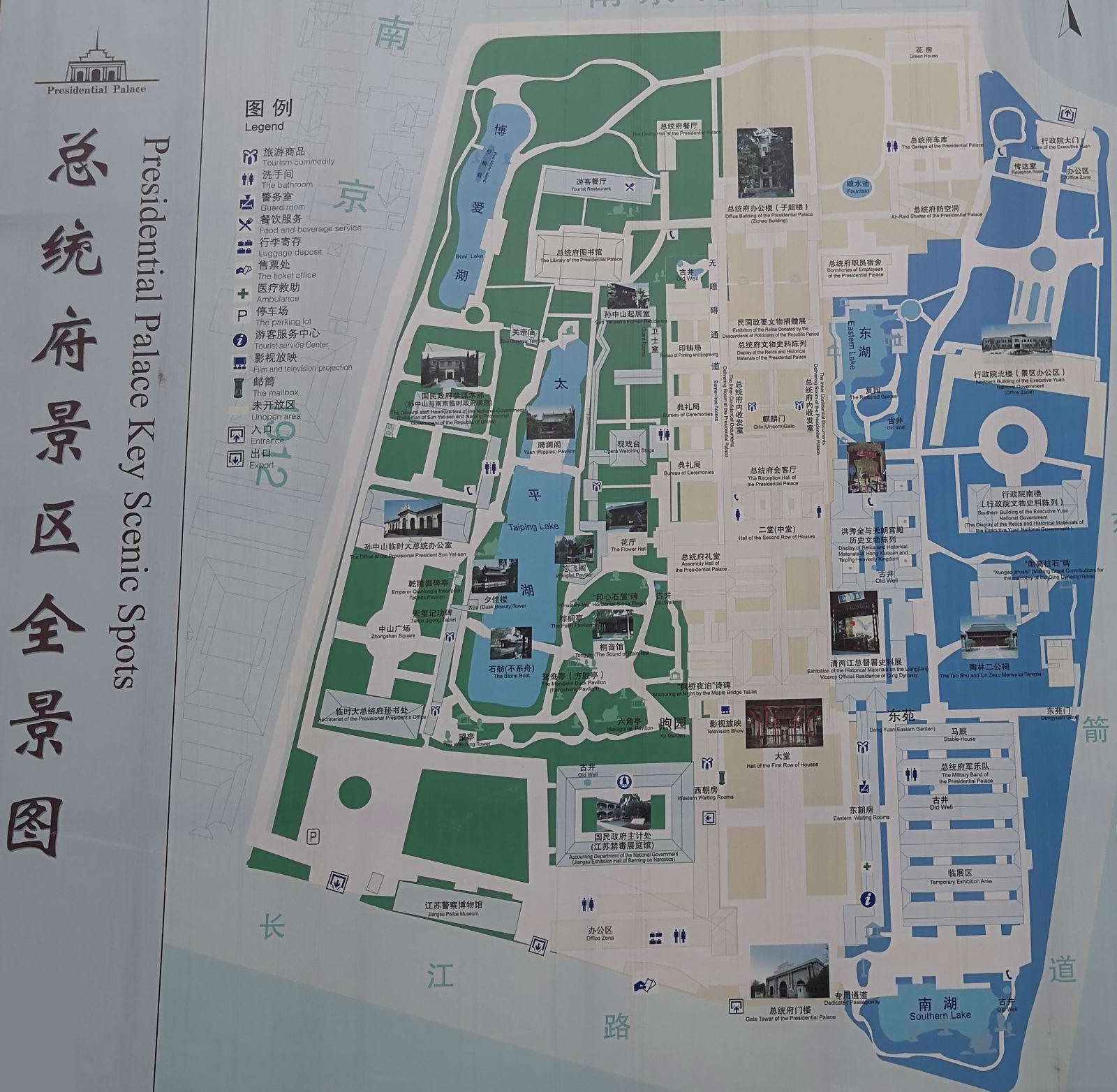 總統(tǒng)府(中國近代史博物館)占地面積9萬平方米,共分三個參觀區(qū)域。中區(qū)(中軸線)主要是國民政府、總統(tǒng)府及所屬機構(gòu);西區(qū)是孫中山的臨時大總統(tǒng)辦公室、秘書處和西花園,以及參謀本部等;東區(qū)主要是行政院舊址、馬廄和東花園。一系列展館和史料陳列,則分布在這三個區(qū)域中。