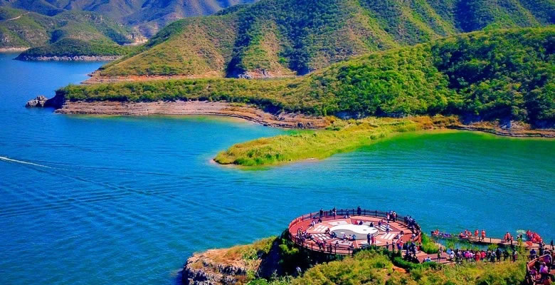 易水湖,原名安格莊水庫,位于河北省保定市易縣縣城西南25千米處,距北京150千米,距雄安新區(qū)80千米,易水湖南側(cè)與狼牙山相連,北側(cè)是紫荊關(guān),西側(cè)是五峰寨,東側(cè)是九龍山,被稱為“北方小桂林”。易水湖是20世紀50年代利用四周高聳的山勢而修建的一座人工湖。易水湖水域面積約27平方千米,容量為3.9億立方米,最深處達48.5米。易水湖屬海河流域,大清河水系。易水湖依托山水自然資源和易文化,開發(fā)為度假區(qū),已建有易水文化休閑度假小鎮(zhèn)、養(yǎng)生島康養(yǎng)小鎮(zhèn)、老子峰3100米臨水棧道、高端度假湖景酒店、易水山谷、水上運動等業(yè)態(tài)項目。