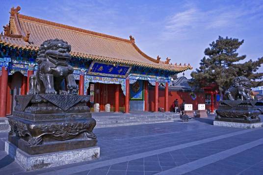大召,明代稱“弘慈寺”,歷史上又有“銀佛寺”“大乘法輪召”“甘珠爾廟”“帝廟”等多種稱謂。大召,是一座大藏傳佛教寺院,是呼和浩特最早建成的黃教寺院,也是蒙古地區(qū)僅晚于美岱召的蒙古人皈依黃教初期所建的大型寺院之一,屬于格魯派(黃教)。占地面積約3萬平方米,其中建筑面積為8000多平方米。大召寺院座北向南,總體布局是伽藍(lán)七堂形制,由正院、東倉和西倉三大院落單位成,東西兩倉各有倉門,北端互通構(gòu)成環(huán)繞寺廟的甬道。主軸線上由山門、天王殿、菩提過殿、大雄寶殿和九間樓組成。大召的藏品豐富,堪稱大召“三絕”的銀佛、龍雕、壁畫佛殿內(nèi)的各種彩塑、金銅造像、晾佛節(jié)展開的巨幅唐卡、108部的甘珠爾經(jīng)卷,以及宗教活動使用的各種法器,面具等都是較珍貴的歷史文物和藝術(shù)珍品。