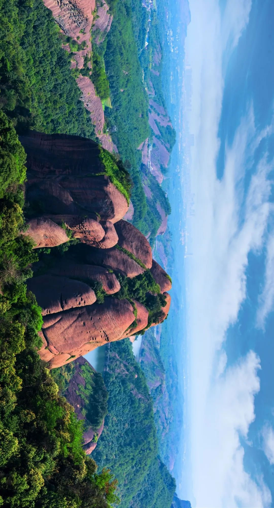 南方丹霞地貌區(qū)向來與人類的居住地雜糅在一起,峭壁之下就是村莊和田地,孤絕的地勢往往又被避難的人們視作天塹、被虔誠的信徒奉為神佛居所。丹霞山、龍虎山、艮山、武夷山等紅色丹霞峰巒浮動于云霧之間,如鯨魚、如海豚般起伏多變。