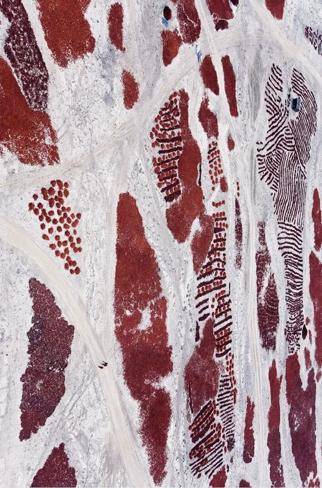 你看,農(nóng)民們辛勞一年,在他們眼中,果園里紅彤彤的蘋果、深紅的大棗是秋天里可愛的笑臉,寧夏的枸杞也紅了,晾曬時鋪滿大地,斑斕可愛。鋪滿地面的,更有新疆的辣椒,顏色本就極紅,單獨一顆已是十分鮮艷奪目,現(xiàn)在不計其數(shù)的辣椒平攤在戈壁曠野之上,鋪天蓋地連成一片,仿若熊熊烈火燎原,幾乎燒到了天邊。