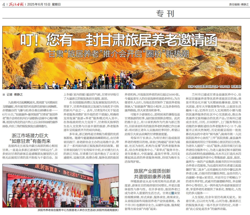 作為中國最大的游客輸出省之一,浙江始終是甘肅極為看重的優(yōu)質(zhì)客源地。隨著2025年度的夏季避暑游高峰期將近,6月15日,“如意康養(yǎng)·漫享隴原”甘肅省“旅居養(yǎng)老”推介會正式走進杭州,本次大會由甘肅省民政廳、甘肅省老齡協(xié)會主辦,甘肅省福利彩票發(fā)行管理中心協(xié)辦,來自浙隴兩地民政部門、養(yǎng)老機構(gòu)、旅行社、新聞媒體圈的數(shù)百位嘉賓與市民游客參加了本次推介活動。