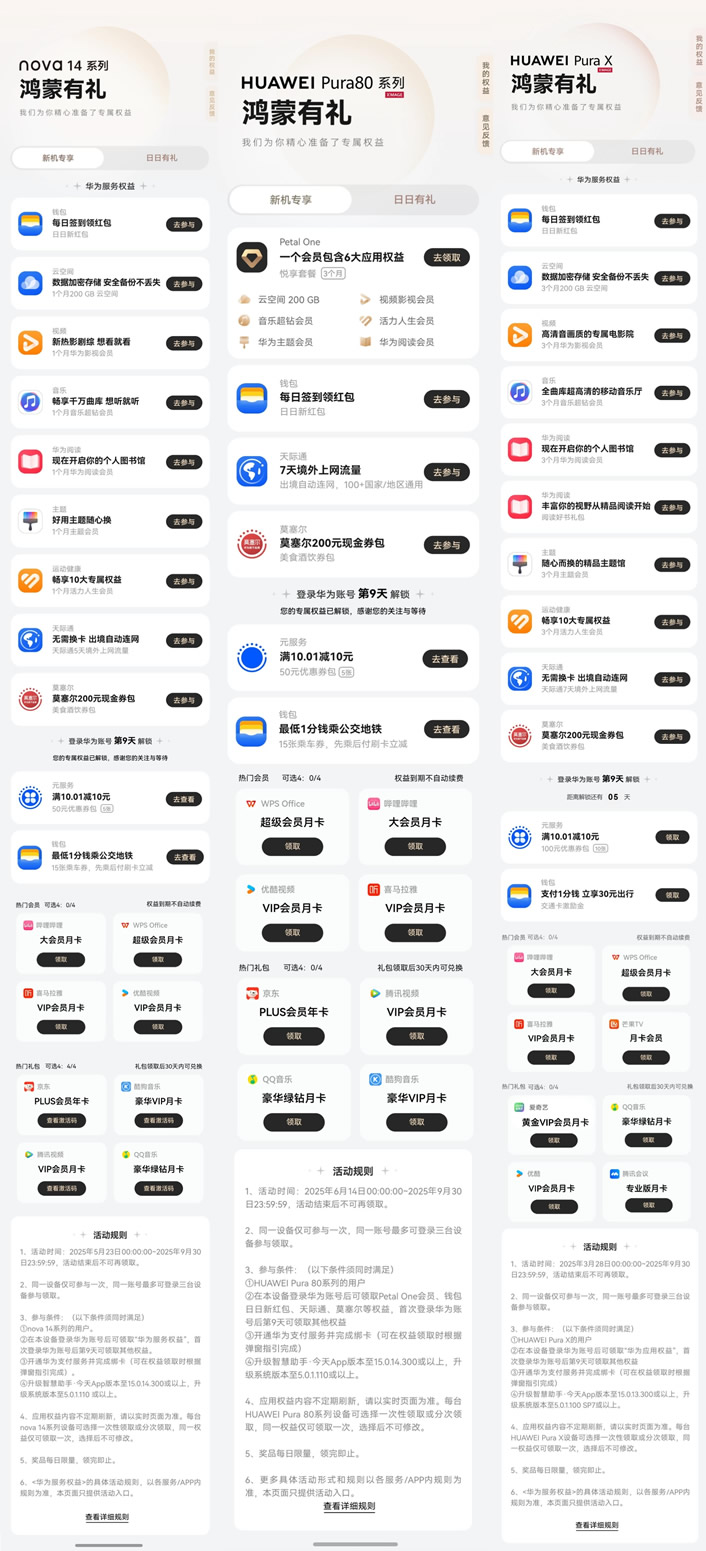 暑期,華為“負(fù)一屏”還上線了“鴻蒙有禮”權(quán)益禮包,覆蓋影視娛樂、旅行交通、外賣餐飲等多重場景,為用戶帶來更便捷、更優(yōu)惠、更智慧的暑期生活服務(wù)。購買Pura X、nova 14系列及Pura 80的新用戶還有額外的“新機(jī)專享”禮包。喚醒小藝說:“幫我領(lǐng)鴻蒙有禮”也能跳轉(zhuǎn)領(lǐng)取。