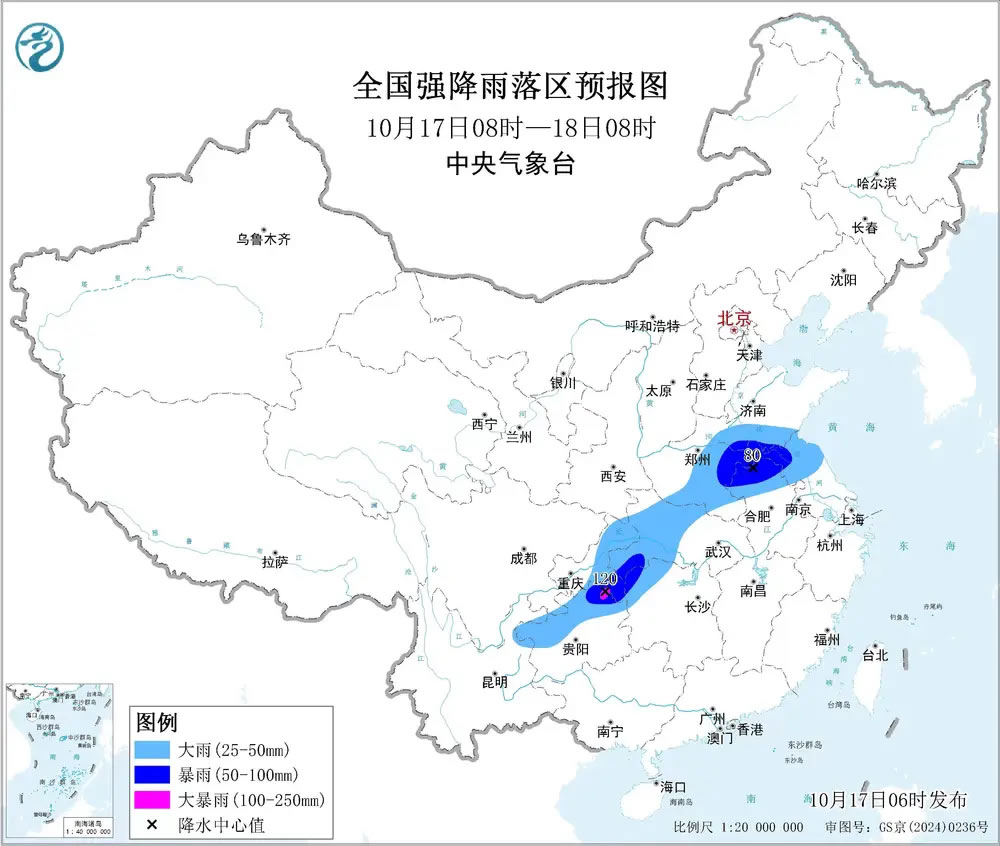 預(yù)計,10月17日8時至18日8時,重慶東部和北部、湖北中西部、河南中東部、山東南部、安徽北部、江蘇北部、湖南西北部、貴州西部和北部等地部分地區(qū)有大到暴雨,其中,重慶東南部、貴州東北部等地局地有大暴雨(100~120毫米)。上述部分地區(qū)伴有短時強降水(最大小時降雨量20~40毫米,局地可超過50毫米),局地有雷暴大風等強對流天氣。
