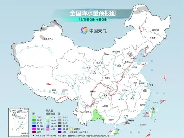 具體來看,今天,新疆北疆北部和南疆西部山區(qū)、內(nèi)蒙古東北部、黑龍江西北部、西藏東部等地部分地區(qū)有小到中雪或雨夾雪,其中,新疆北疆北部等地有大雪。貴州西南部、云南東部、廣西西部、海南島、臺(tái)灣島等地部分地區(qū)有小雨。