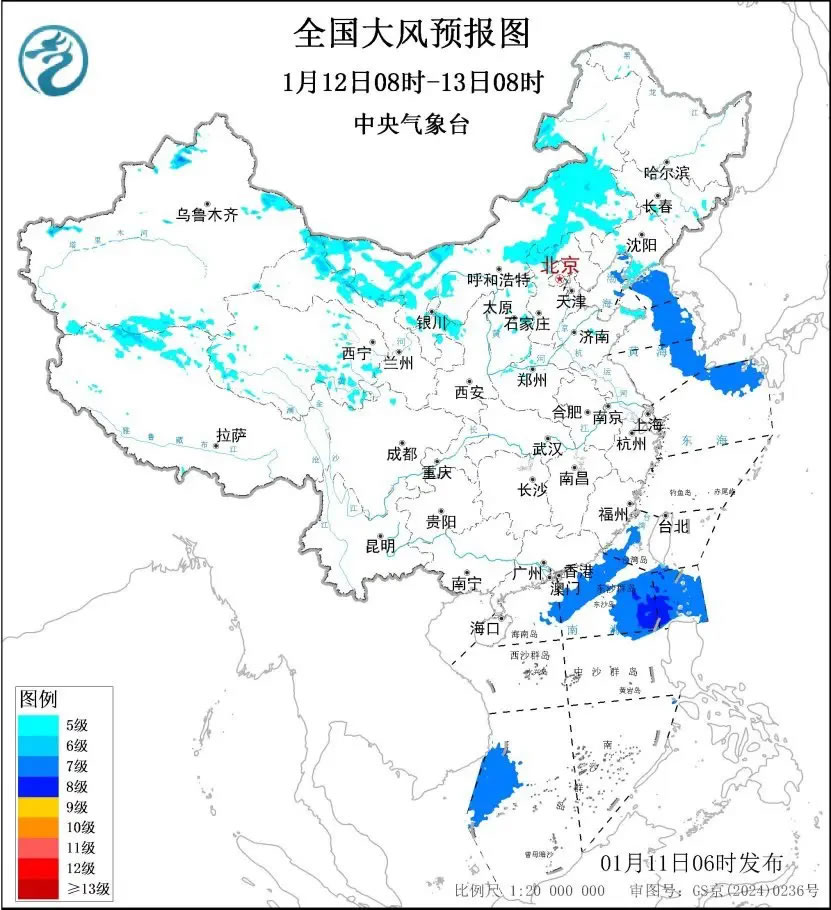 1月12日08時至13日08時,內(nèi)蒙古中西部、甘肅西部、寧夏北部、華北北部、山東半島、遼東半島等地部分地區(qū)有5~6級大風(fēng)、陣風(fēng)7~9級;渤海、渤海海峽、黃海大部海域、東海北部海域、臺灣海峽、巴士海峽、南海北部和西南部海域?qū)⒂?~8級、陣風(fēng)9級的風(fēng)。