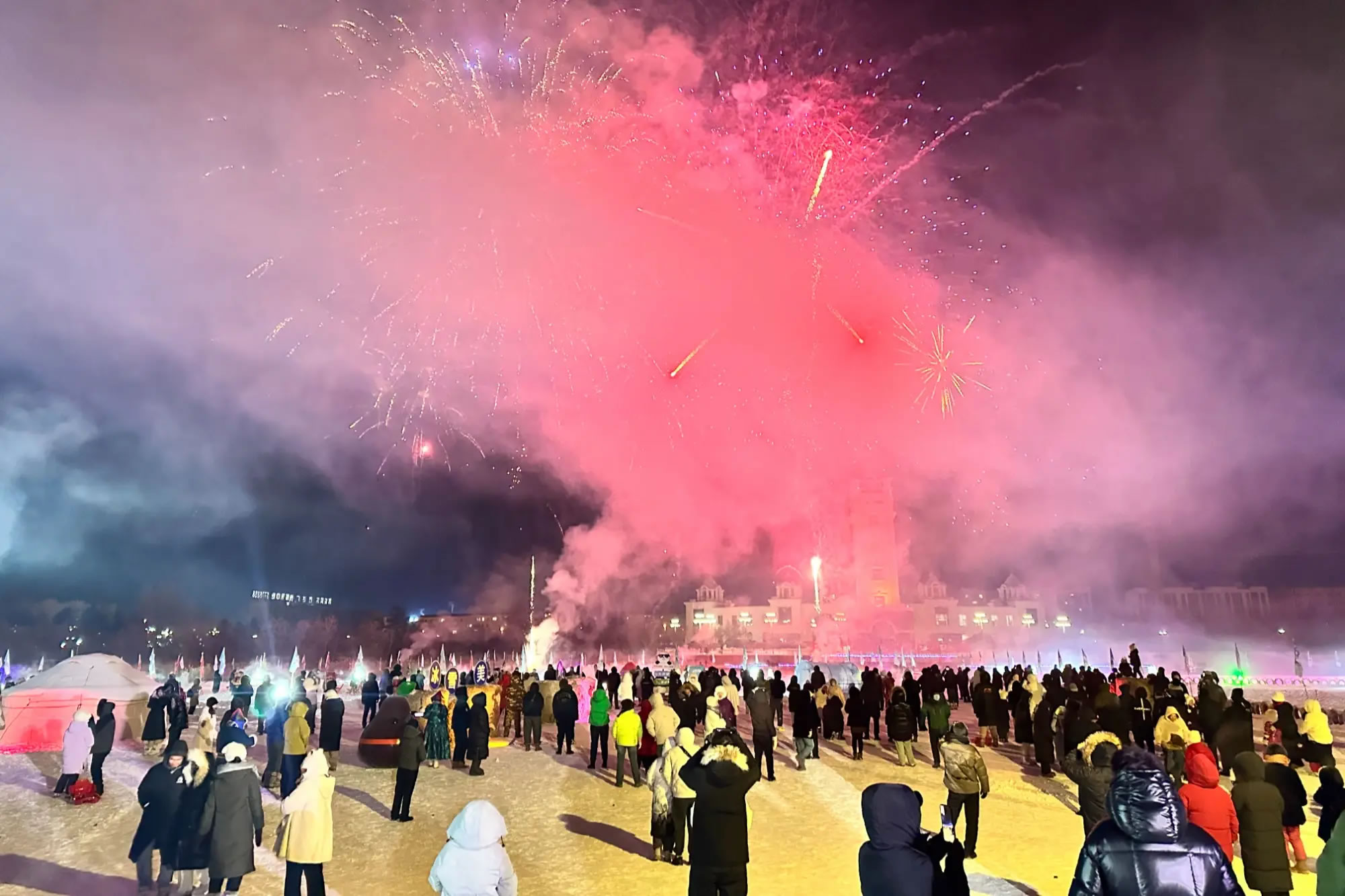 當晚,無人機表演和煙花秀成為開園活動的一大亮點。無人機在夜空中變換造型,與冰雪景觀交相呼應,隨后綻放的煙花點亮夜空,將現(xiàn)場氛圍推向高潮,吸引游客駐足觀看、拍照留念。