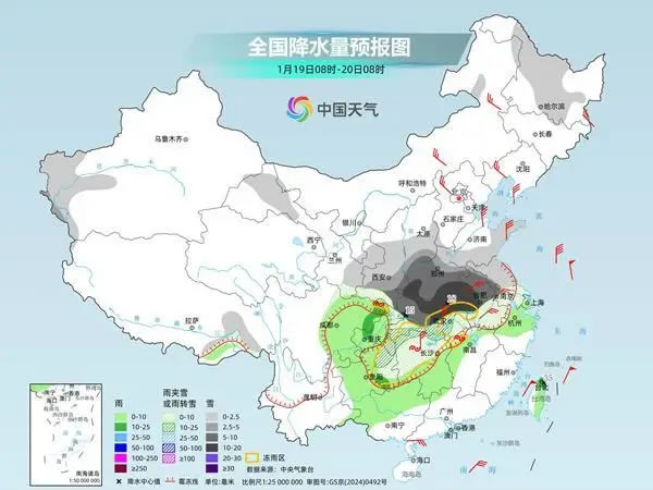 今起三天(1月19日至21日),寒潮持續(xù)影響中東部,大部地區(qū)有雨雪冰凍天氣過程,氣溫下降劇烈,多地降溫后將體驗(yàn)同期少見的寒冷。其中今天,雨雪天氣進(jìn)入過程最強(qiáng)時段,河南、湖北、安徽等地部分地區(qū)或遭遇暴雪,公眾需注意防范。