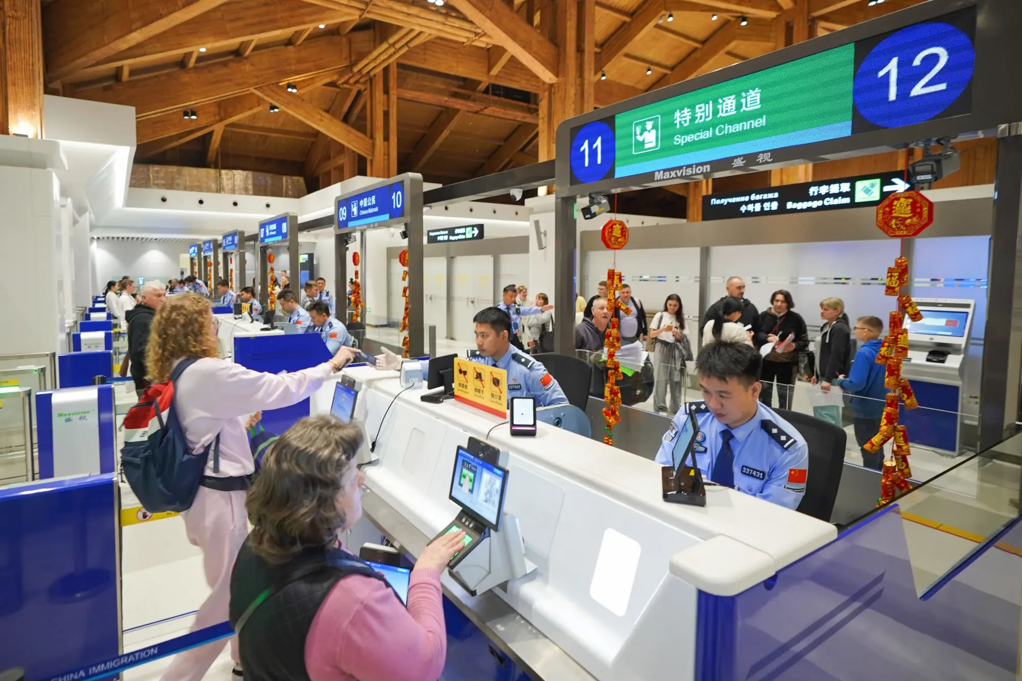 為應(yīng)對春節(jié)假期出入境客流高峰,美蘭、鳳凰出入境邊防檢查站提前發(fā)布客流高峰預(yù)測,實時監(jiān)測旅客流量變化,加強(qiáng)現(xiàn)場勤務(wù)組織,合理安排執(zhí)勤警力,提前開足查驗通道,增設(shè)現(xiàn)場標(biāo)識指引,推出24小時直接過境免辦邊防檢查手續(xù)、外國人入境卡網(wǎng)上填報、團(tuán)體旅游簽證網(wǎng)上申辦等系列便利措施,確保中外旅客高效、順暢通關(guān)。