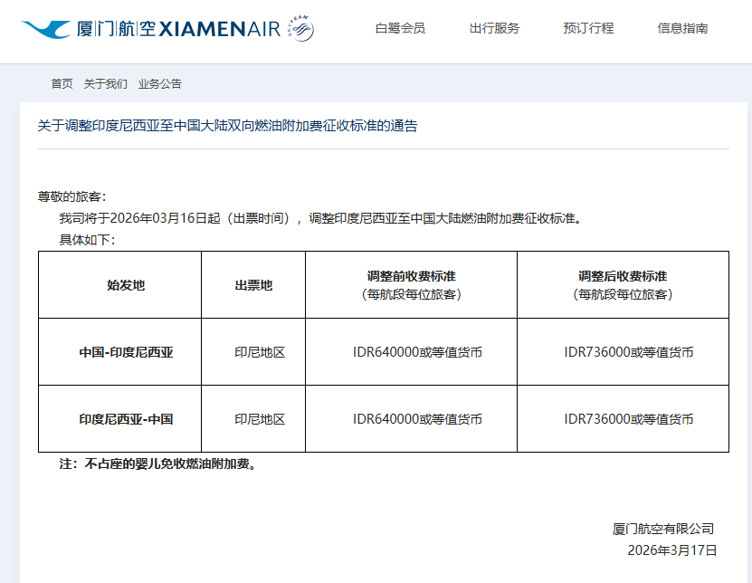 3月17日,吉祥航空官網(wǎng)發(fā)布溫馨提示稱,因國際燃油價格調(diào)整,自2026年3月20日起(以出票時間為準(zhǔn))調(diào)整中國與東南亞國家之間航線燃油附加費收費標(biāo)準(zhǔn)。