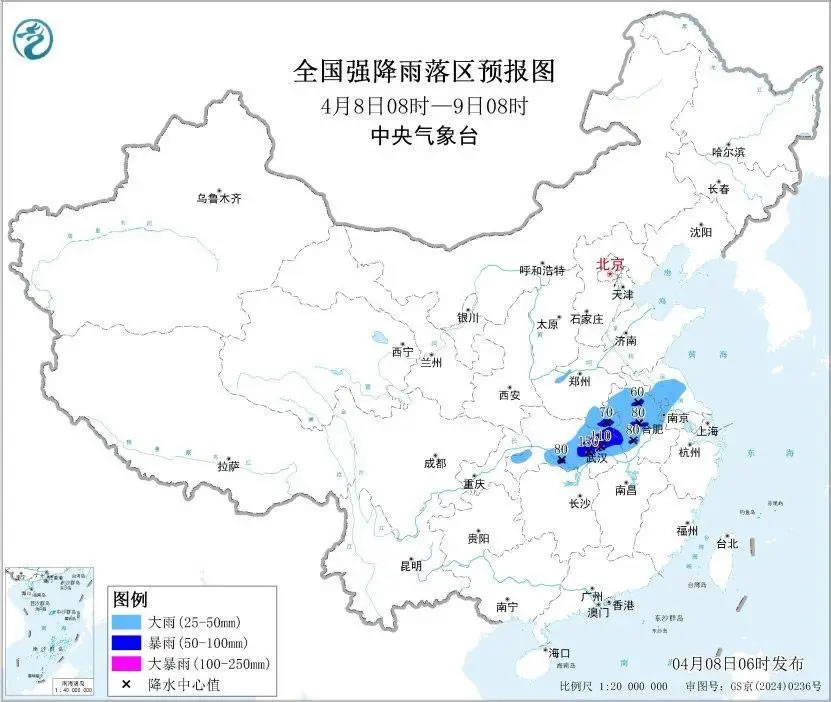 預(yù)計(jì),4月8日8時(shí)至9日8時(shí),湖北南部和東部、安徽中北部、河南南部、江蘇中北部等地部分地區(qū)有大到暴雨,其中,湖北東部局地有大暴雨(100~150毫米)。上述部分地區(qū)伴有短時(shí)強(qiáng)降水(最大小時(shí)降雨量20~40毫米,局地可超過50毫米),局地有雷暴大風(fēng)或冰雹等強(qiáng)對(duì)流天氣。