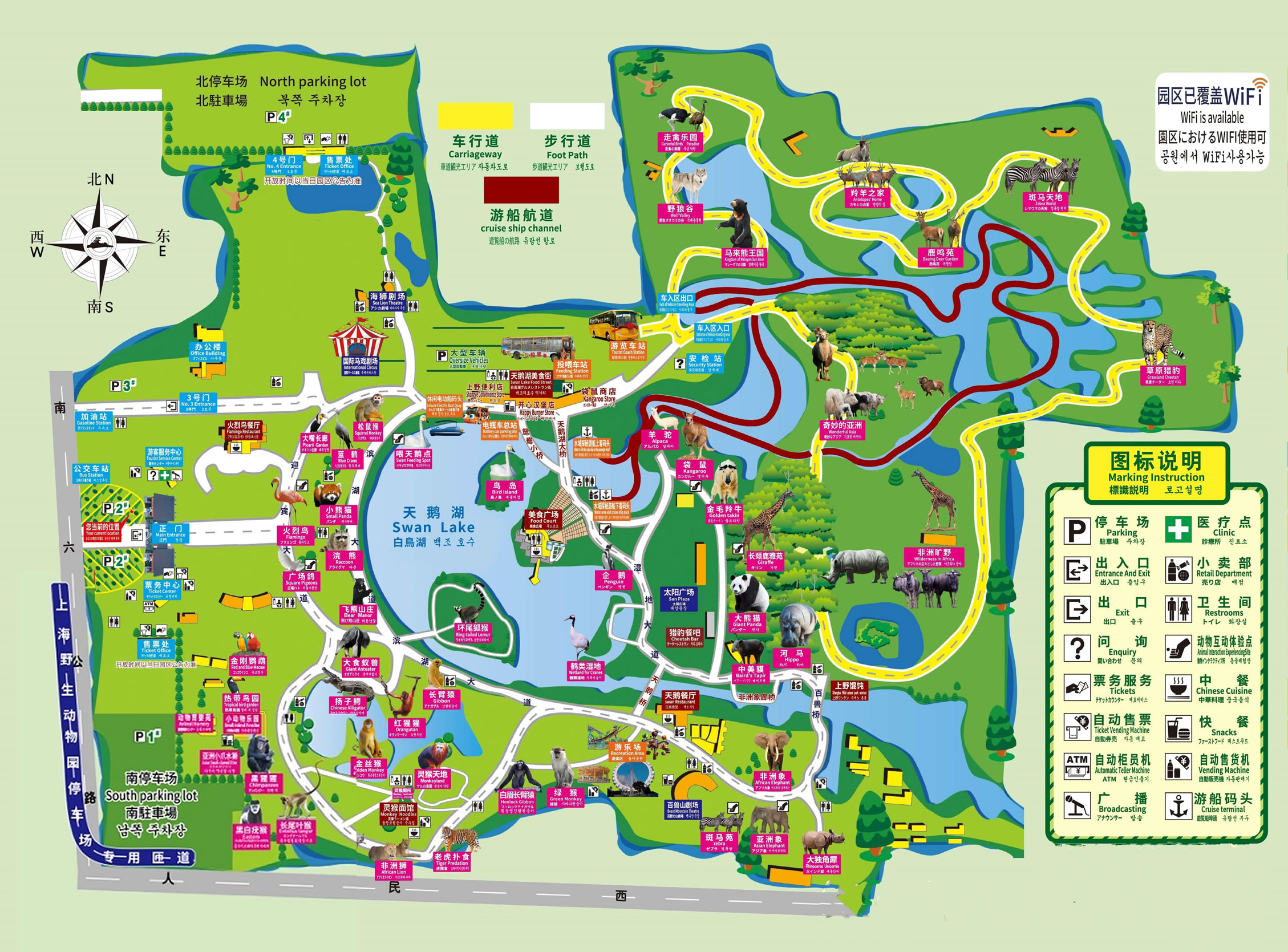 上海野生動物園現(xiàn)有車入區(qū)、步行區(qū)兩大區(qū)域。車入區(qū)分布著奇妙的亞洲、非洲曠野、優(yōu)雅長頸鹿、最美閃電俠、草原霸主、荒野大力熊、森林之王、白虎領地、野狼谷、馬來熊王國10大主題區(qū)域。步行區(qū)則分布著大熊貓館、鶴類濕地、火烈鳥展區(qū)、企鵝館、天鵝湖、羊駝苑、紅猩猩館、中美貘館、小動物樂園、鸚鵡館、河馬館、白眉長臂猿展區(qū)、大食蟻獸展區(qū)、鱷魚島、狐猴島、浣熊展區(qū)、金絲猴島、飛熊山莊、綠猴區(qū)、白虎展區(qū)、松鼠猴、小熊貓區(qū)、黑猩猩館、袋鼠坡、長頸鹿雅苑、亞洲象展區(qū)、金毛羚牛館、國禮非洲獅展區(qū)、熱帶鳥園、斑馬苑、非洲象展區(qū)、老虎撲食區(qū)、白頰長臂猿島、藍鶴、大獨角犀、大嘴長廊、靈猴天地、亞洲小爪水獺展區(qū)、太陽廣場共39個館區(qū)。