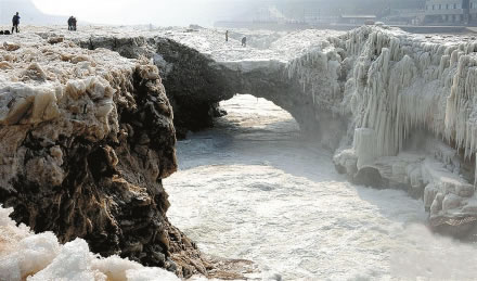 隆冬季節(jié),壺口一帶黃河水面封凍,有的地段冰層較厚,形成聯(lián)接兩岸的天然橋梁,稱黃河冰橋。