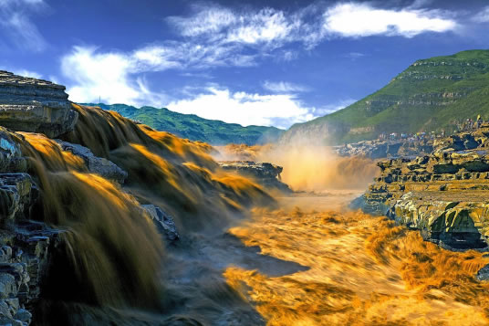 在高處河岸上,幾乎是看不到“龍槽”和黃河水流,只能看到紫褐色基巖河床中一線急騰翻卷的黃濁水塵和聽到轟鳴不息的奔騰濤聲。這槽中激流就象一鍋滾沸的水,左奔右奪,奔騰翻滾急下,激起的水霧彌漫在龍槽之上,使黃河在這里變得朦朦朧朧。每逢汛期黃河水漲時(shí),洪水溢出壺口龍槽一端,龍槽東岸會(huì)出現(xiàn)一道一、二千米長(zhǎng)的漫流水簾,十分壯觀。遠(yuǎn)望龍槽,彎彎曲曲的峽中石槽,活象一條搖頭擺尾的巨龍,壺口是龍頭,一口吞沒(méi)黃河巨流。孟門是龍尾,腹泄河水于下游。