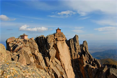 蘆芽山因形似一“蘆芽”而得名,海拔2736米,主峰絕頂約10平方米的石坪上,巍然托起一座石砌建筑——太子殿。因其位居群山之極,數(shù)十里外即可看到。