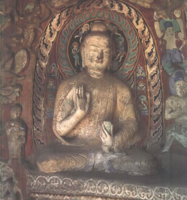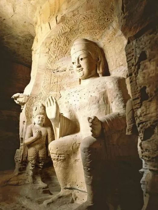 第19窟主佛像結(jié)跏趺坐,佛像耳輪齊肩,下頜崩毀,著袒右肩袈裟,輕薄貼體,衣紋簡(jiǎn)潔明快。佛像右手舉胸施無畏印,左手掌心向上握法衣于膝上,以表達(dá)佛法的無畏與傳承。窟外東西耳洞中,各雕刻一尊倚坐佛像,西耳洞佛像,耳廓寬大垂肩,體魄挺拔勁健。這種分窟安置三世佛的布局設(shè)計(jì),既有變化,又顯莊嚴(yán),是北朝石窟形制的新創(chuàng)舉。