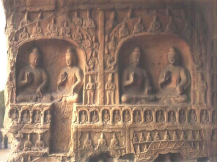 拱門高3.1米,寬2.25米。外側(cè)雕刻尖形門楣,內(nèi)飾忍冬紋。門外西側(cè)崩塌,經(jīng)近期修補(bǔ),東側(cè)現(xiàn)存一力士,風(fēng)化嚴(yán)重。拱門西壁下部風(fēng)化嚴(yán)重。中部北側(cè)雕一圓拱龕,內(nèi)為坐佛。龕外兩側(cè)各雕一脅侍菩薩。龕楣內(nèi)雕七佛,龕兩側(cè)各雕五重千佛龕。中部南側(cè)雕一方形龕,內(nèi)為坐佛,龕外兩側(cè)各雕一脅侍菩薩。上層為方形帷幕龕,西壁雕坐佛坐于蓮座之上,兩側(cè)各雕一脅侍菩薩,南、北兩壁各雕一立佛,下雕蓮座。拱門東壁中、下部雕零散小龕,風(fēng)化嚴(yán)重。上部北側(cè)雕三層佛塔一座,塔下雕一圓拱龕,內(nèi)為坐佛。南側(cè)雕一盝形帷幕龕,內(nèi)為交腳菩薩,龕南側(cè)崩塌,F(xiàn)存北側(cè)一思惟菩薩與飛天。龕楣方格內(nèi)雕坐佛。 |