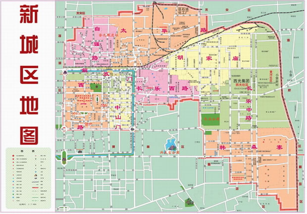 新城區(qū)轄9個街道:西一路街道、長樂中路街道、中山門街道、韓森寨街道、解放門街道、自強(qiáng)路街道、太華路街道、長樂西路街道、胡家廟街道。