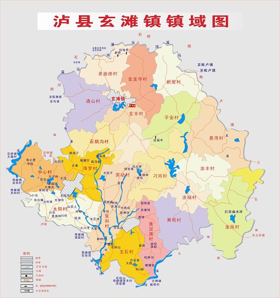 瀘縣玄灘鎮(zhèn)鎮(zhèn)域圖 行政區(qū)劃 瀘縣玄灘鎮(zhèn)幅員面積115平方公里,轄區(qū)內(nèi)人口9萬人,城鎮(zhèn)建成區(qū)面積2平方公里,常住人口2.2萬人。轄5個(gè)社區(qū)、20個(gè)行政村《正大街社區(qū)、東街社區(qū)、西街社區(qū)、中和社區(qū)、喻坪社區(qū) 》、《石鵝溝村、金龍寺村老油房村、通山村、石鵝溝村、玄豐村、新屋村、平安村、刁河村、黃坭村、涂場(chǎng)村、龍鳳村、涂豐村、易灣村 、太陽村、中心村、海羅村、玉石村、黃泥灘村、勞動(dòng)村、朱和村》! 歷史沿革 1934年設(shè)玄灘鎮(zhèn),1937年改鄉(xiāng),1951年復(fù)建鎮(zhèn),1958年改公社,1992年再復(fù)鎮(zhèn)。1997年,面積74平方千米,人口5.6萬,轄龍鳳、飛躍、永紅、涂鋒、刁河、馮光、黃泥、同豐、黃林、新山、平安、光前、紅星、向?yàn)、易灣、斷石龍、新屋、蔣灣、金龍寺、新房子、玄鋒、高場(chǎng)、陳家咀、石鵝溝、通山、萬居所、桑壩、東風(fēng)、宋糟坊、瓦子壩、清油坊31個(gè)行政村和正大街、馬路街、半邊街、鹽聯(lián)街4個(gè)居委會(huì)。 2004年,面積78平方千米,轄31個(gè)村、4個(gè)社區(qū),總?cè)丝?7621人。集鎮(zhèn)建成區(qū)面積1.7平方千米,常住人口2.15萬人。 2006年,將原玉河鎮(zhèn)所屬行政區(qū)域并入玄灘鎮(zhèn)。玄灘鎮(zhèn)政府駐玄灘場(chǎng)。